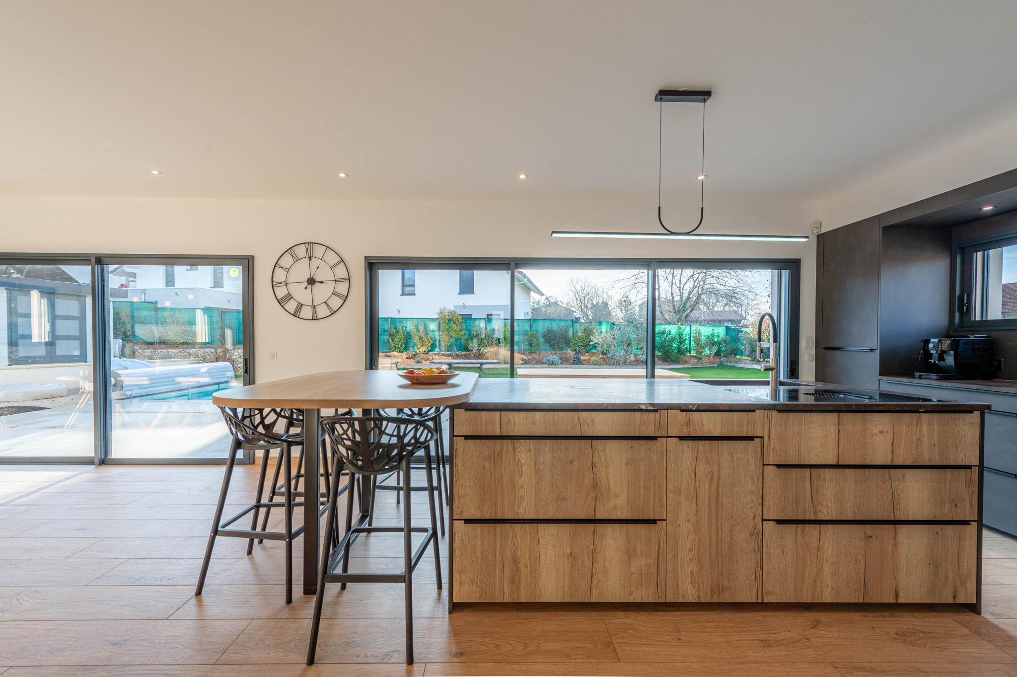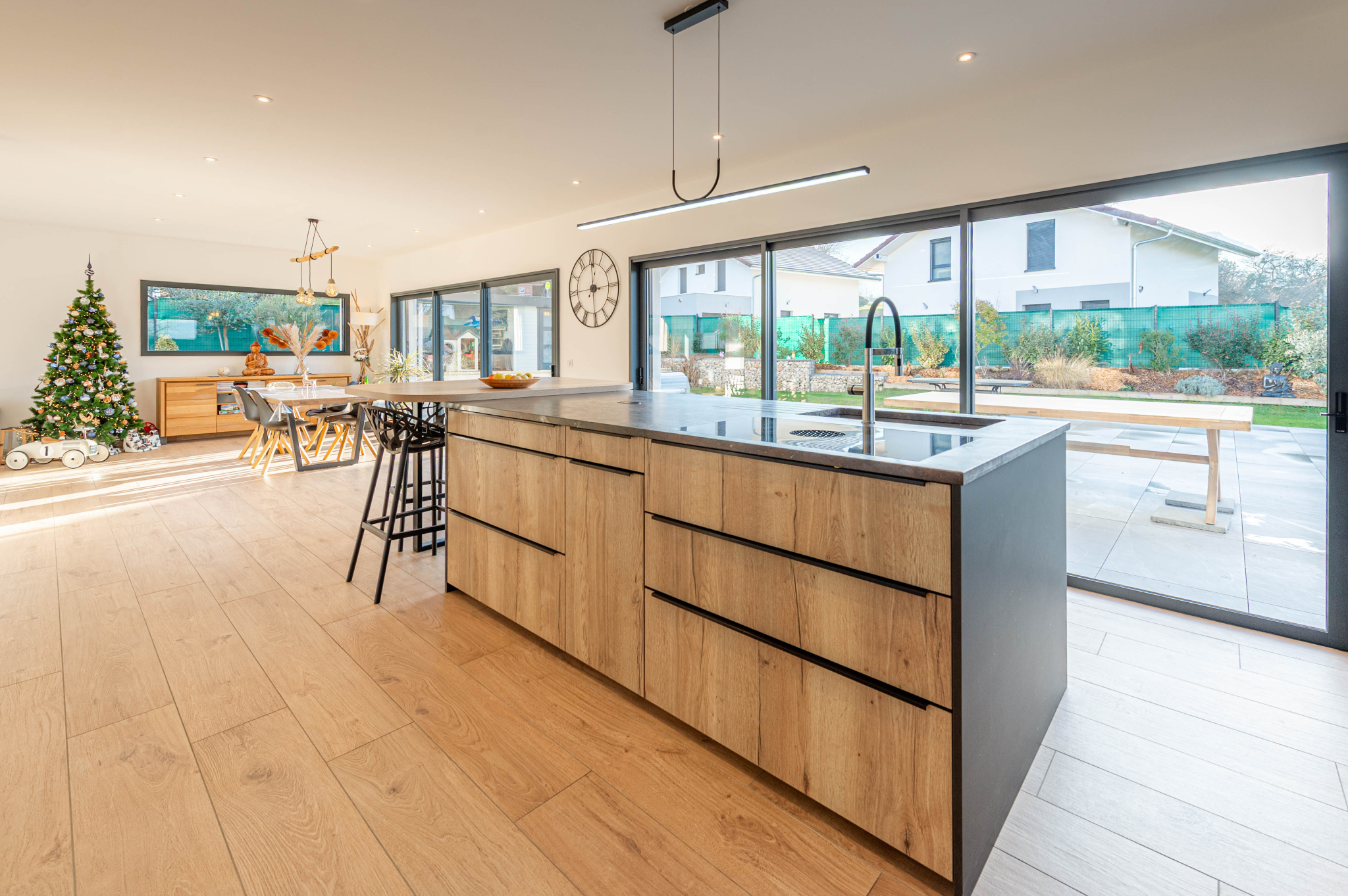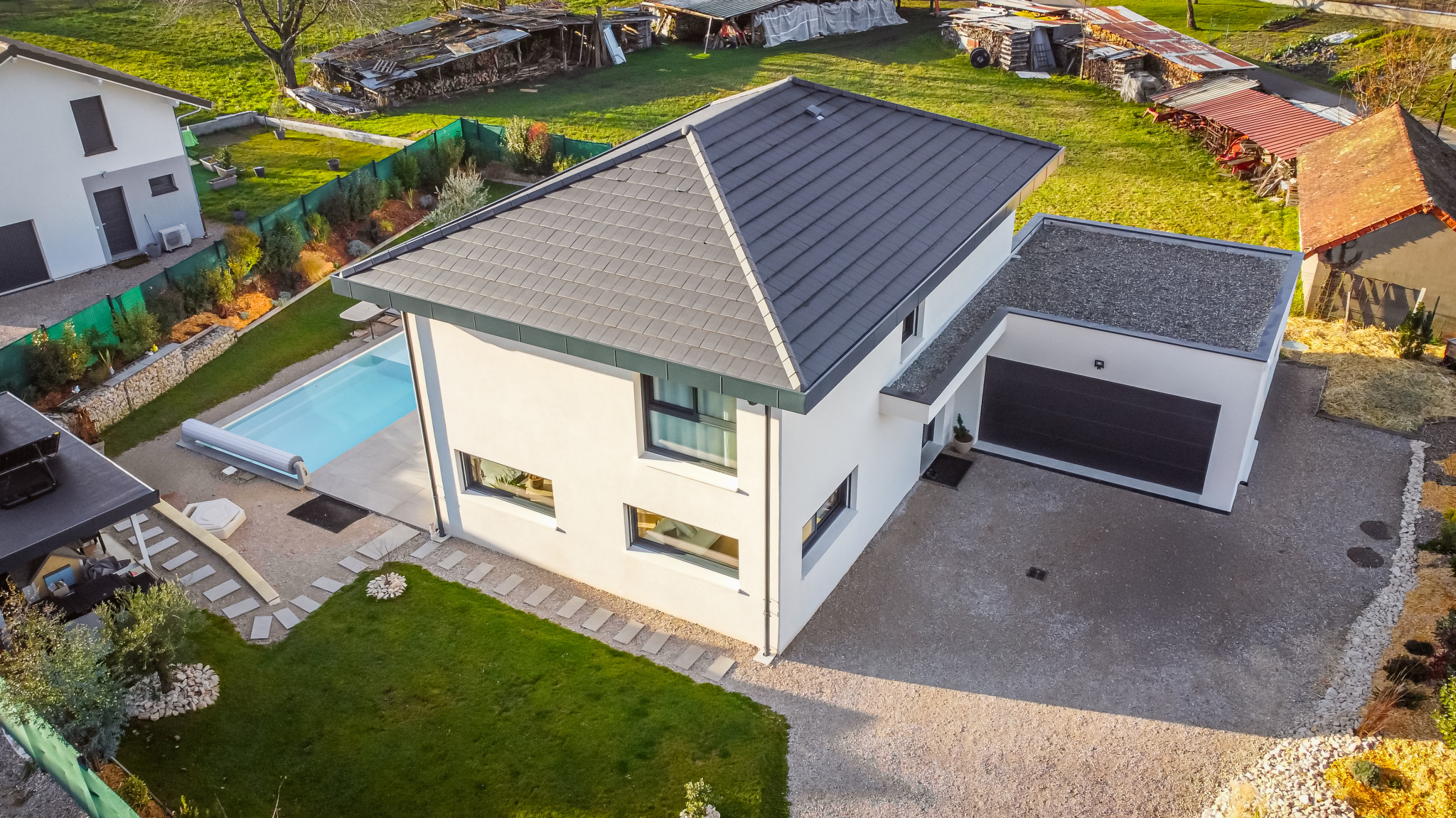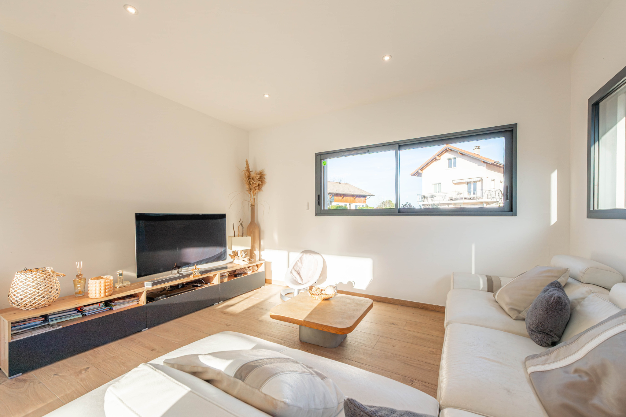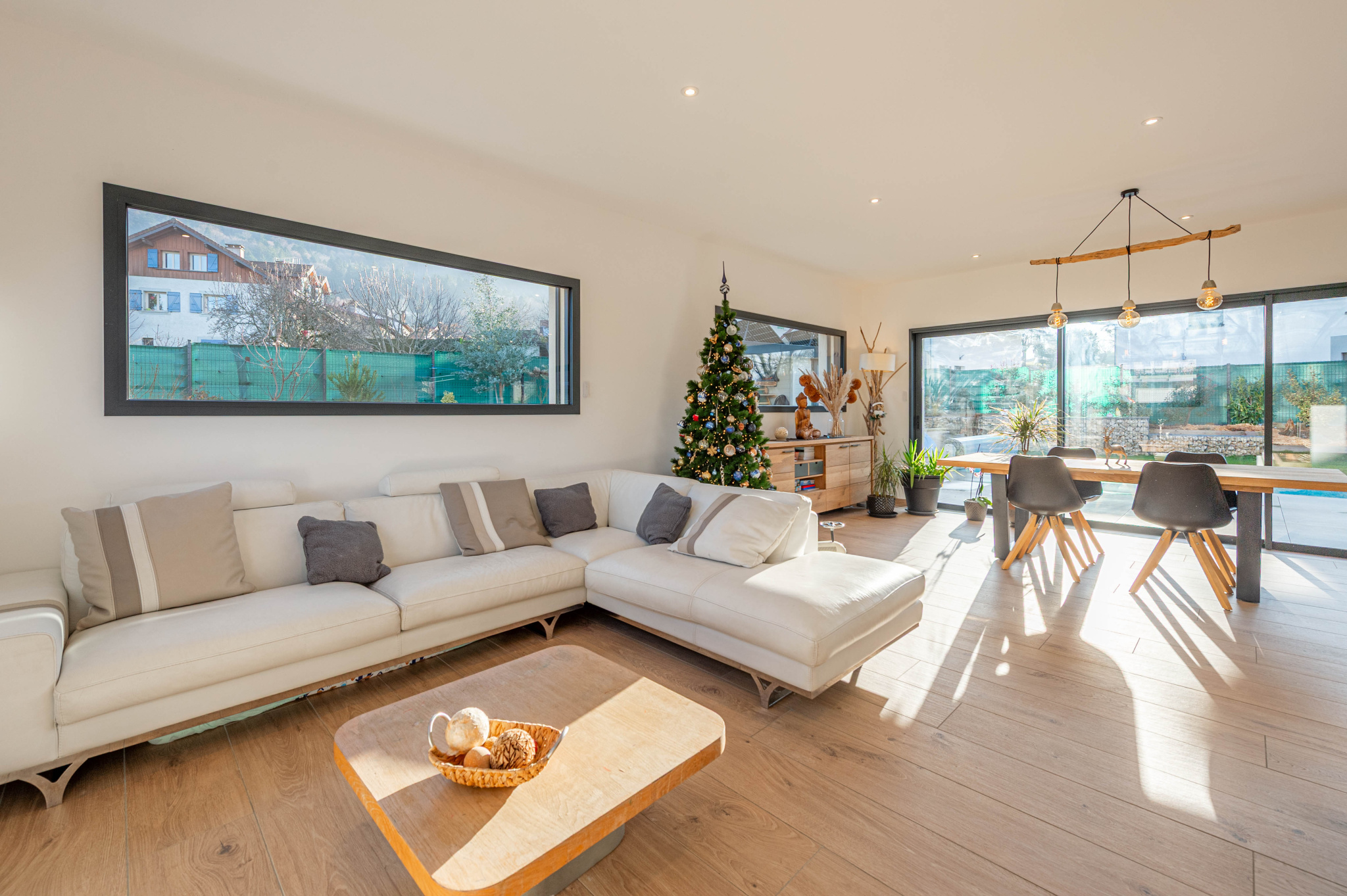 Brenthonne, villa d’architecte contemporaine construite en 2024, offrant des prestations haut de gamme et un confort de vie remarquable. Développant environ 160 m2 habitables sur un terrain plat, arboré et entièrement clôturé de 900 m2, la maison se distingue par ses volumes généreux, sa luminosité et la qualité de ses finitions.