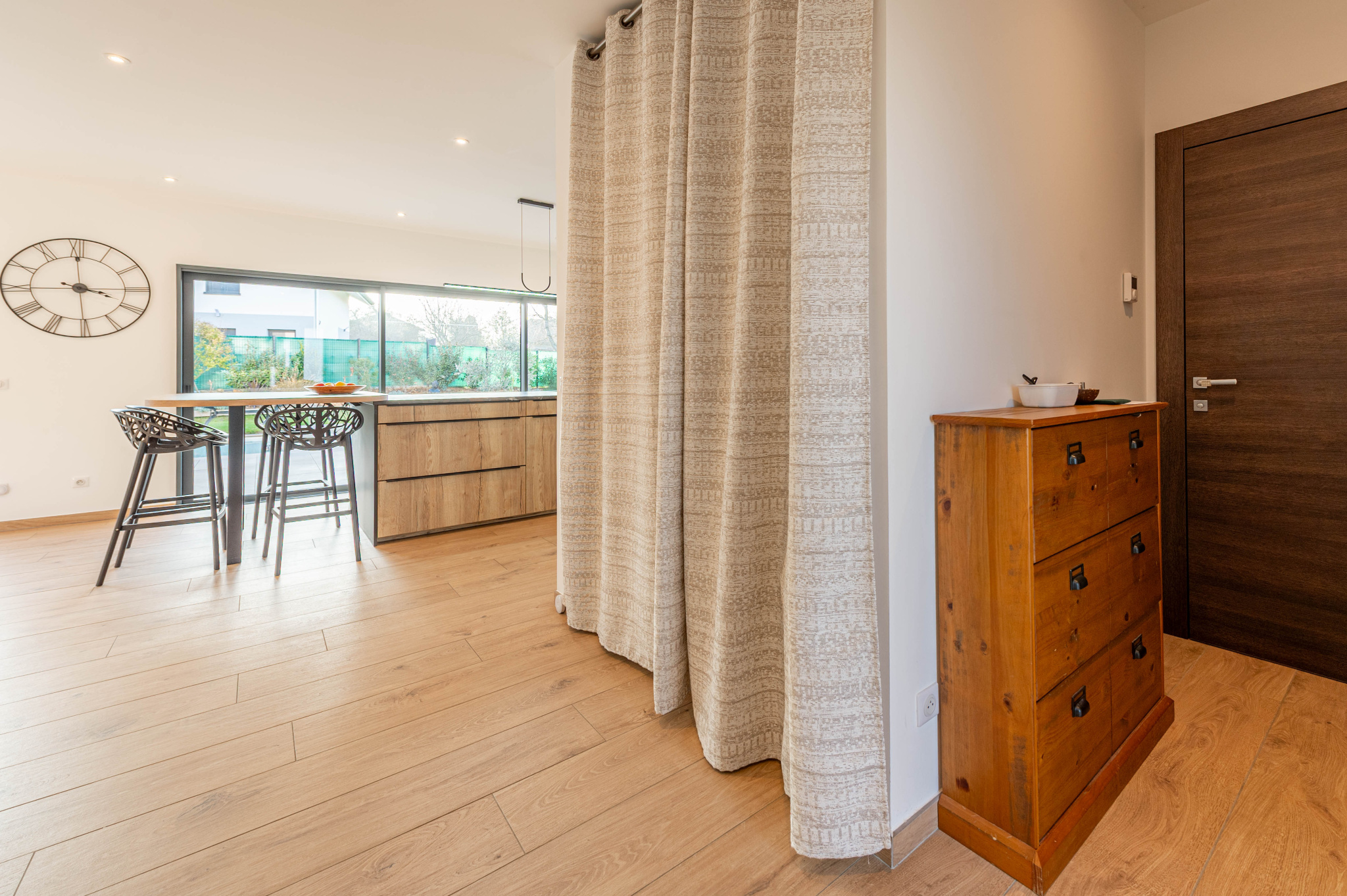 Au rez-de-chaussée, une vaste pièce de vie d’environ 80 m2, baignée de lumière grâce à de larges baies vitrées toute hauteur, s’ouvre sur la terrasse et la piscine. La cuisine sur mesure, équipée d’un îlot en quartzite et d’électroménager premium, est complétée par un cellier. Ce niveau comprend également une buanderie, des rangements et offre la possibilité d’aménager une cinquième chambre ou une suite avec salle d’eau.