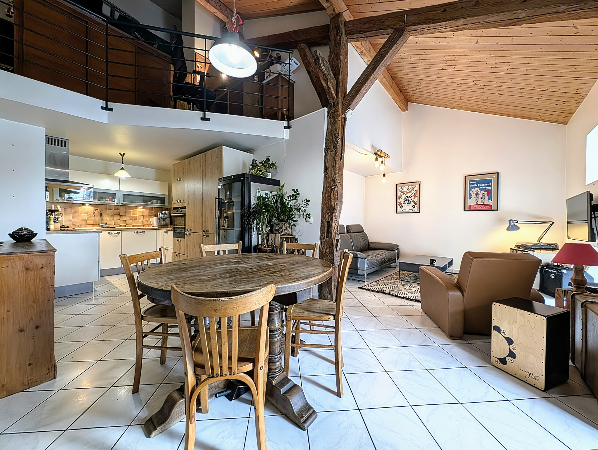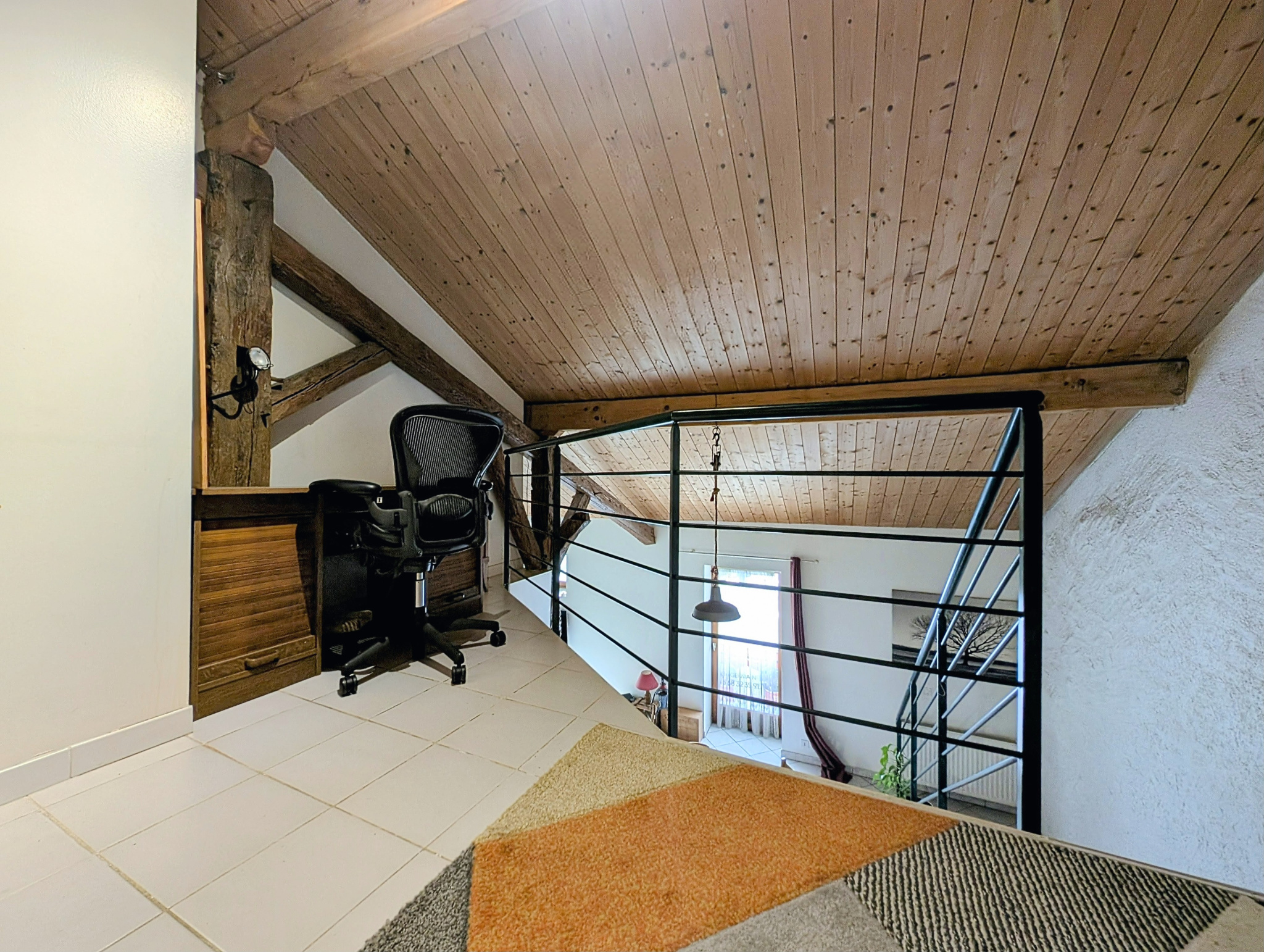 À l’étage :Un espace à fort potentiel comprenant une belle pièce de vie avec poutres apparentes et cuisine ouverte, une chambre, une mezzanine aménagée en espace bureau, un coin nuit et une seconde salle de douche avec WC.