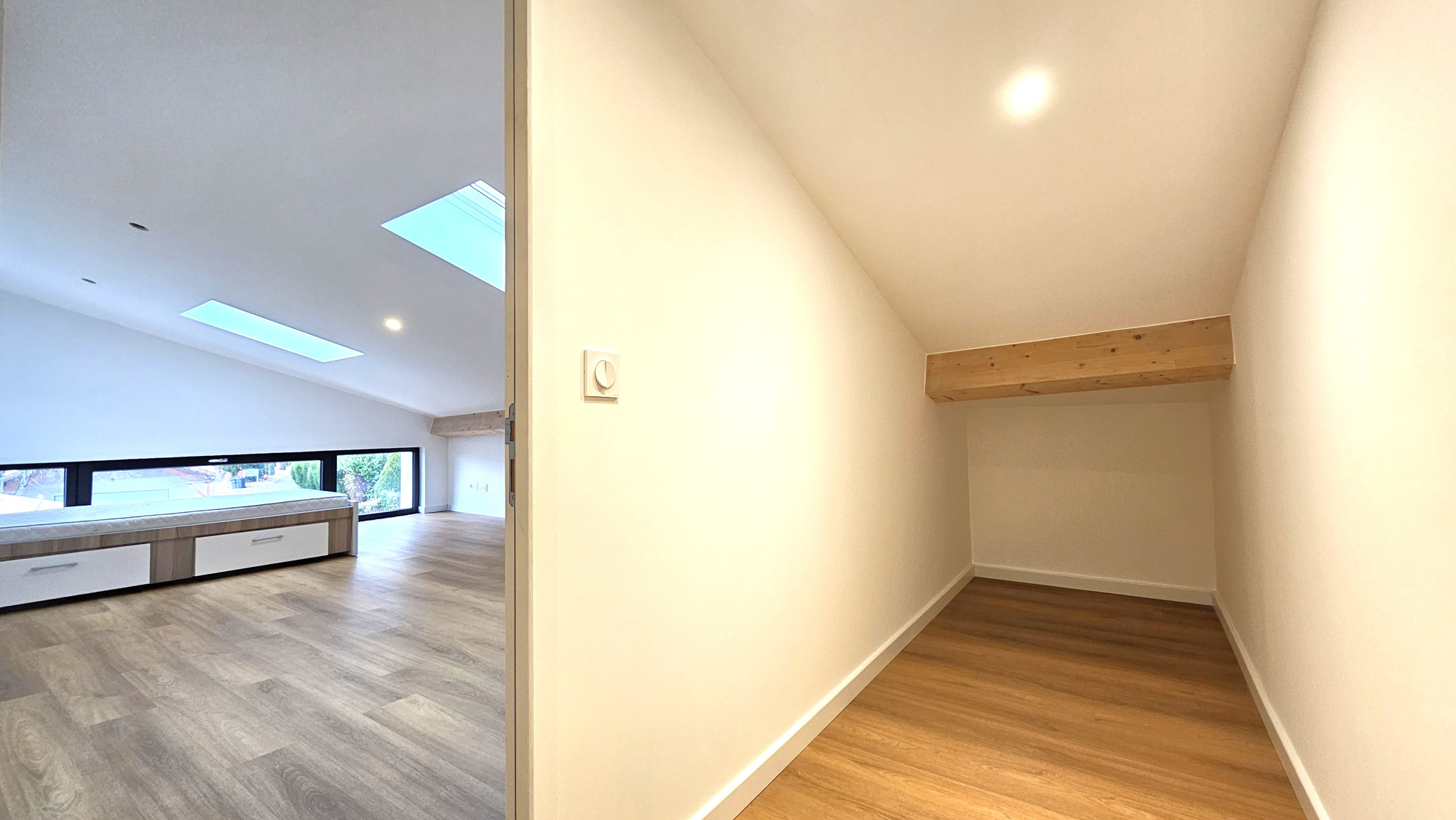 Au second étage, sous les combles, une grande pièce (demande de modification de permis en cours pour ajouter un velux) à utiliser comme chambre pour enfant, chambre d’amis, salle de jeux ou bureau.