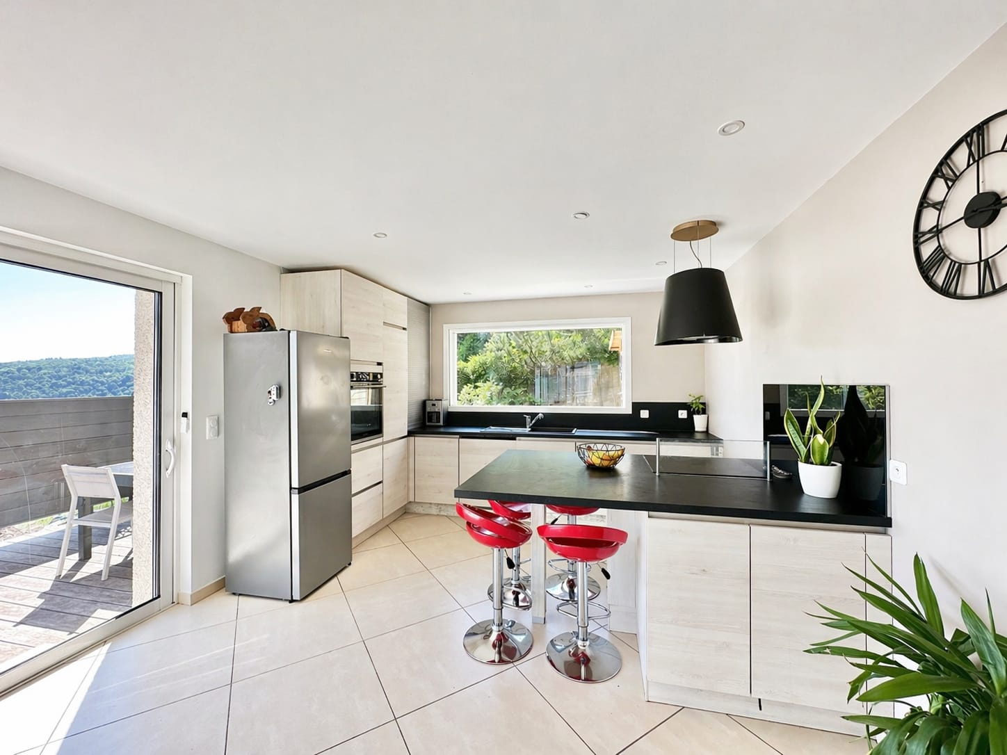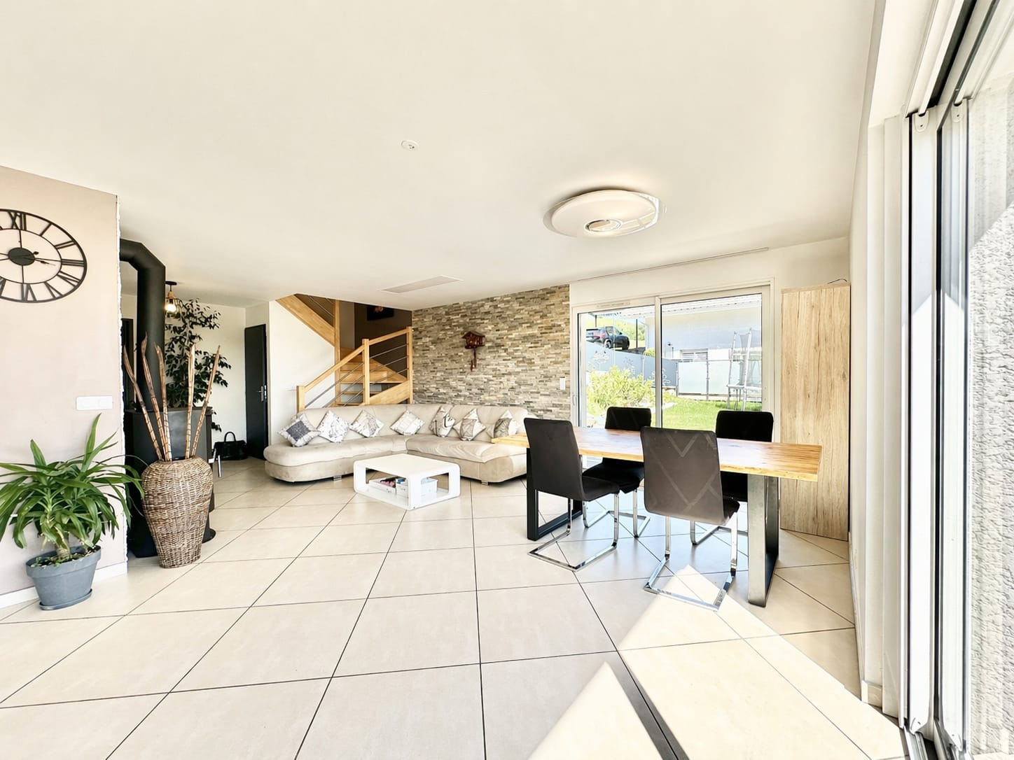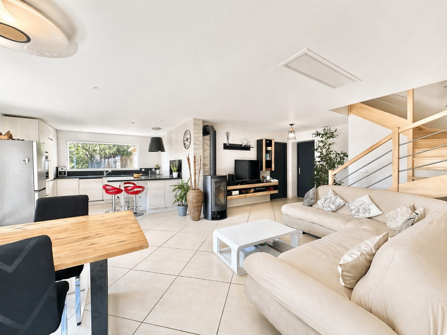 La maison s’ouvre sur une spacieuse pièce de vie lumineuse d’environ 40 m2, composée d’un salon, d’une salle à manger et d’une cuisine ouverte entièrement équipée, créant un espace convivial et fonctionnel.