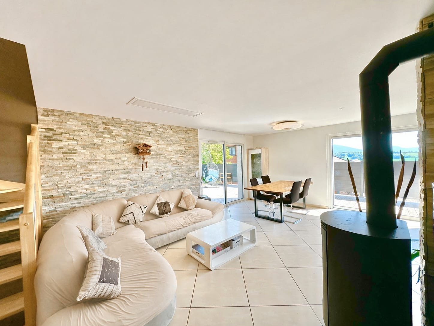 Côté prestations, la maison bénéficie d’un chauffage au sol par pompe à chaleur, complété par un poêle à bois, offrant un confort thermique agréable.