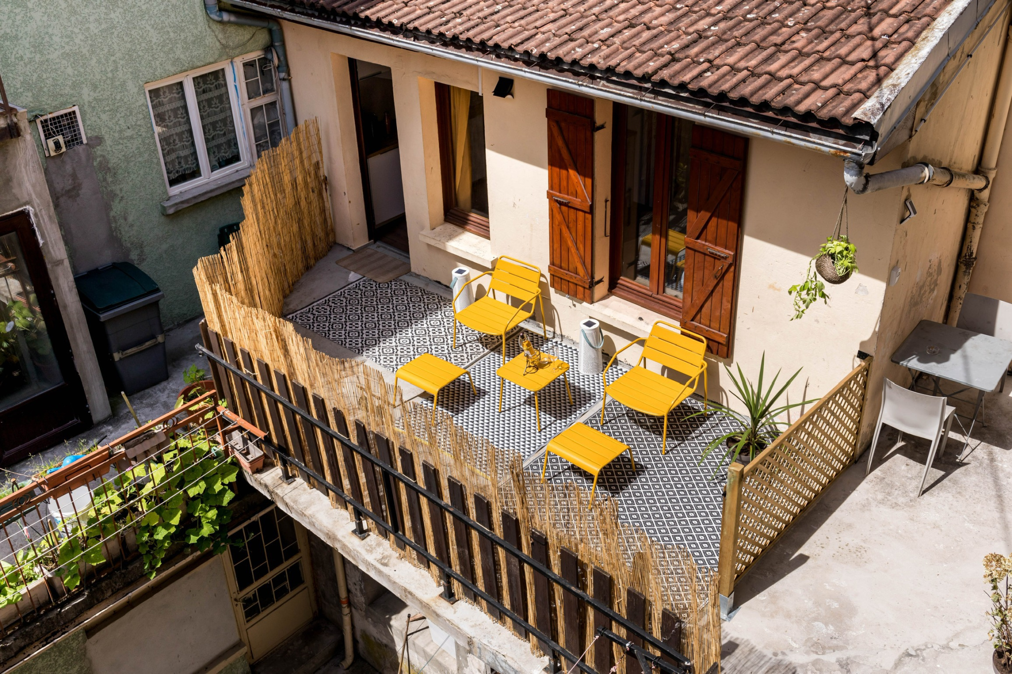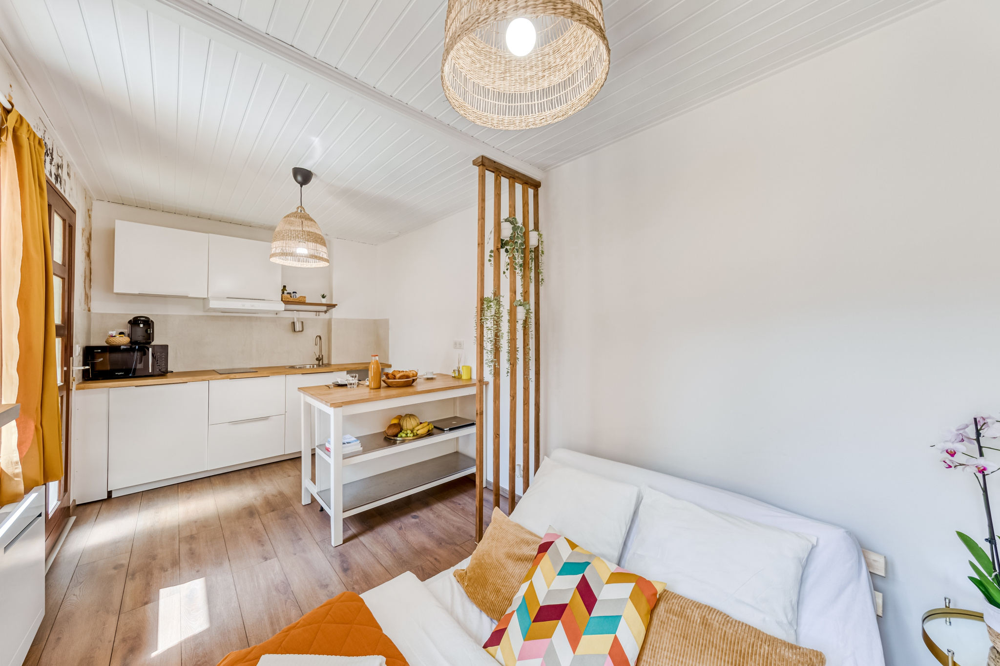 1 studio de 16,16 m2 avec terrasse privative de 17 m2, loué 450 euros en meublé (bail 9 mois renouvelable), situé dans une maisonnette indépendante