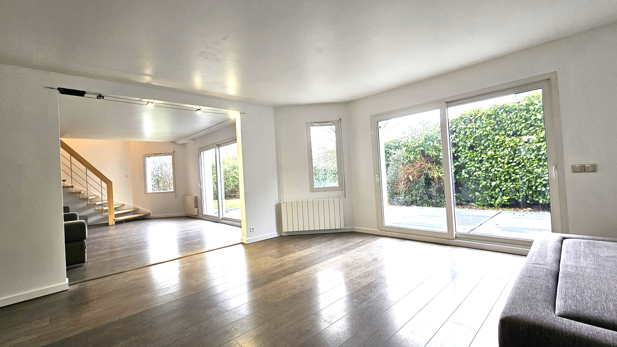 Rez-de-chaussée : Entrée avec rangements, salle de douche avec WC, vaste séjour double d’environ 50 m2 avec grandes baies vitrées ouvrant sur la terrasse et le jardin, cuisine ouverte aménagée et équipée, bureau avec accès terrasse/jardin. L’ancien garage a été aménagé en salle TV avec espace buanderie et rangements. Un conduit existant permet l’installation d’un poêle.