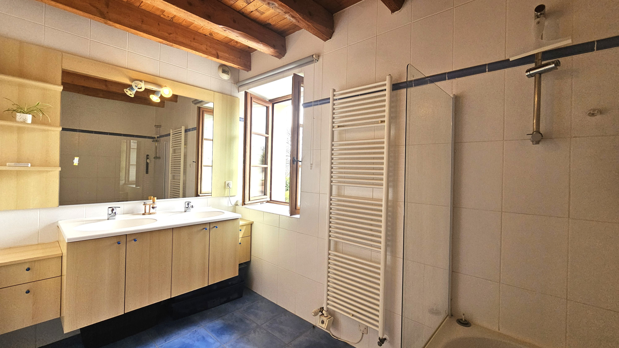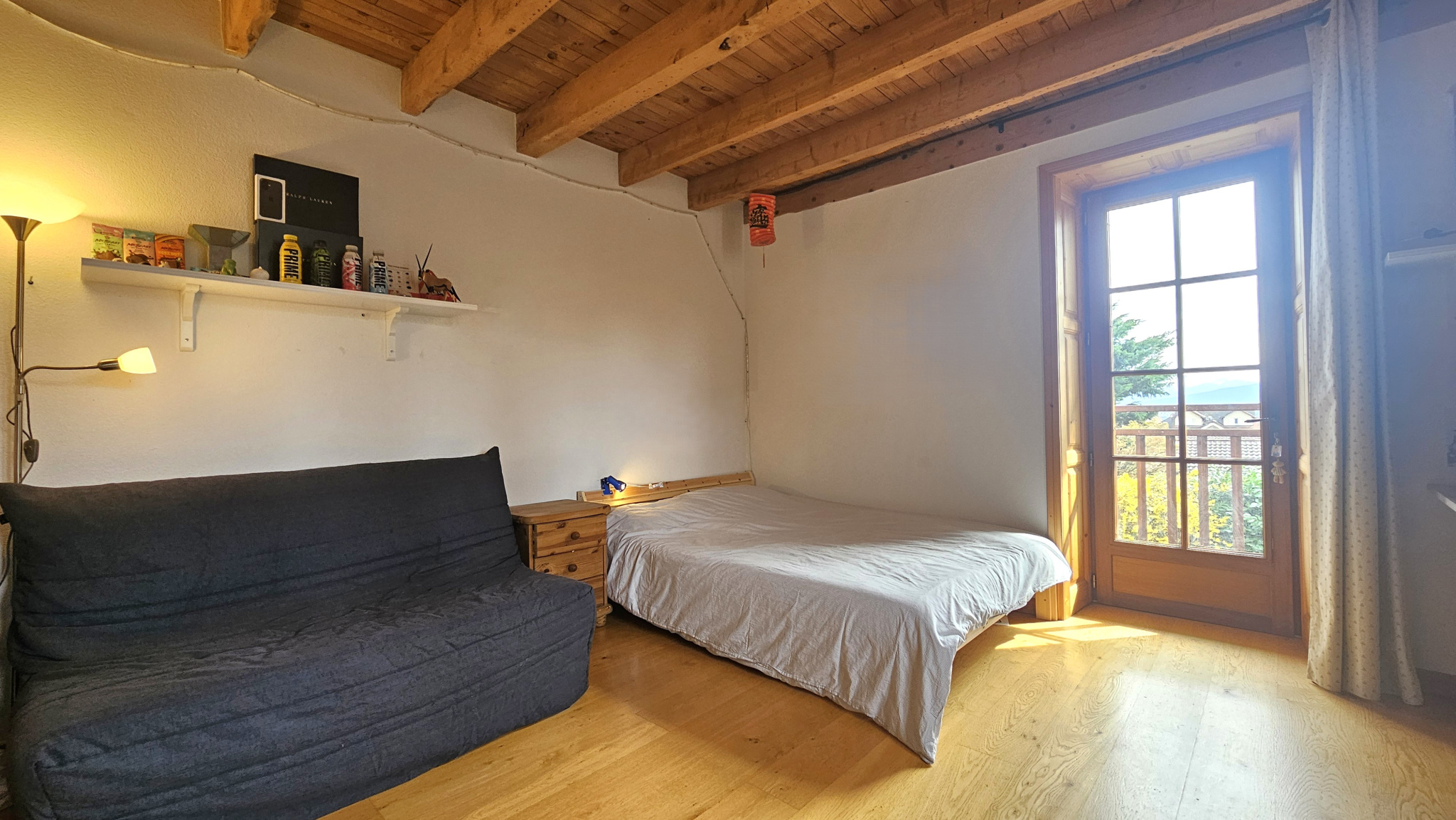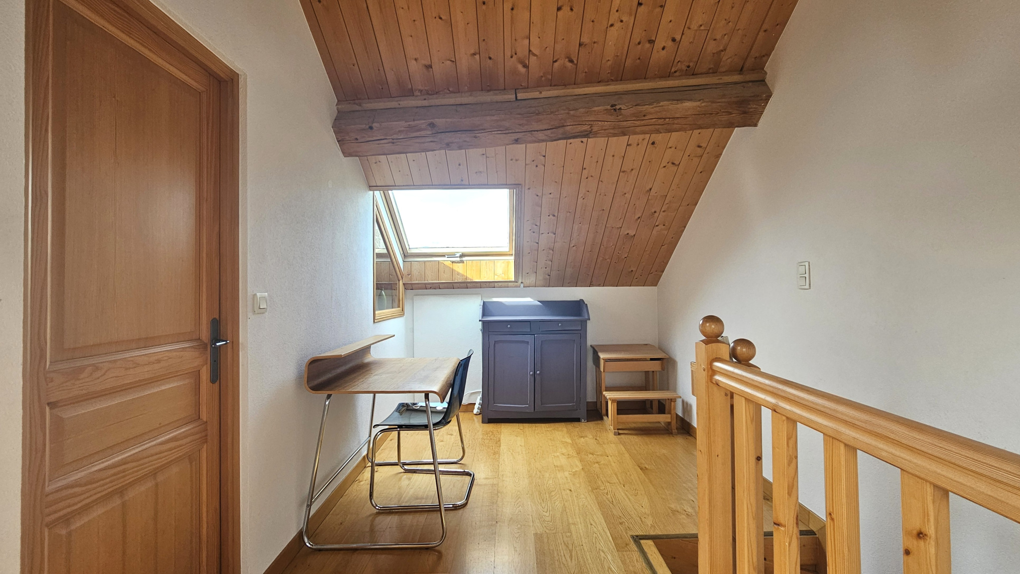 Les combles de 40m2 au sol sont aménagés en espace chambre/bureau avec une salle de douche et WC.