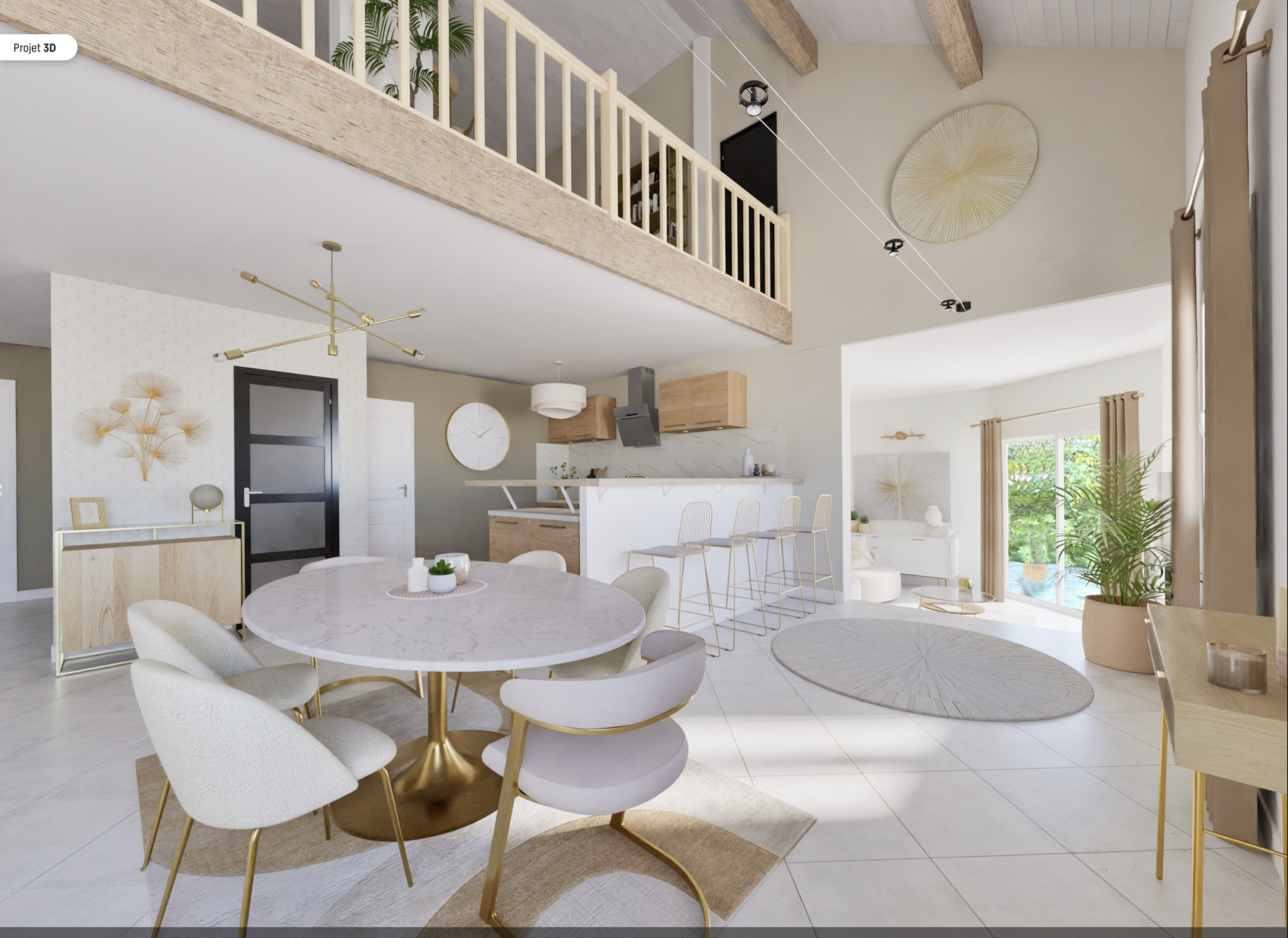 Au rez-de-chaussée, l’entrée avec grands rangements intégrés s’ouvre sur un spacieux salon-séjour ainsi qu’une cuisine ouverte, formant un espace de vie convivial et baigné de lumière. Une buanderie attenante, située entre la cuisine et le garage, apporte un réel confort au quotidien. La mezzanine qui surplombe la pièce accentue la hauteur sous plafond et la sensation d’espace. Ce niveau comprend également une chambre, une salle d’eau et un WC séparé, permettant une vie de plain-pied agréable et fonctionnelle.