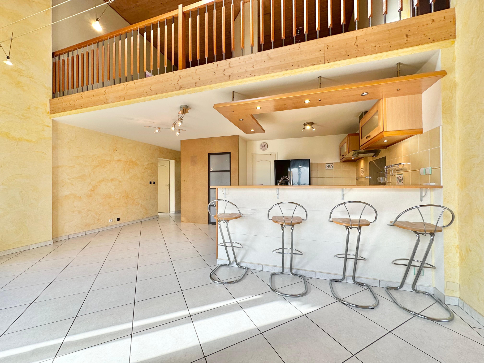 Au premier étage, la mezzanine dessert deux belles chambres ainsi qu’une grande salle de bain avec WC. L’aménagement de l’espace offre également la possibilité de créer une troisième chambre grâce au volume disponible à ce niveau.