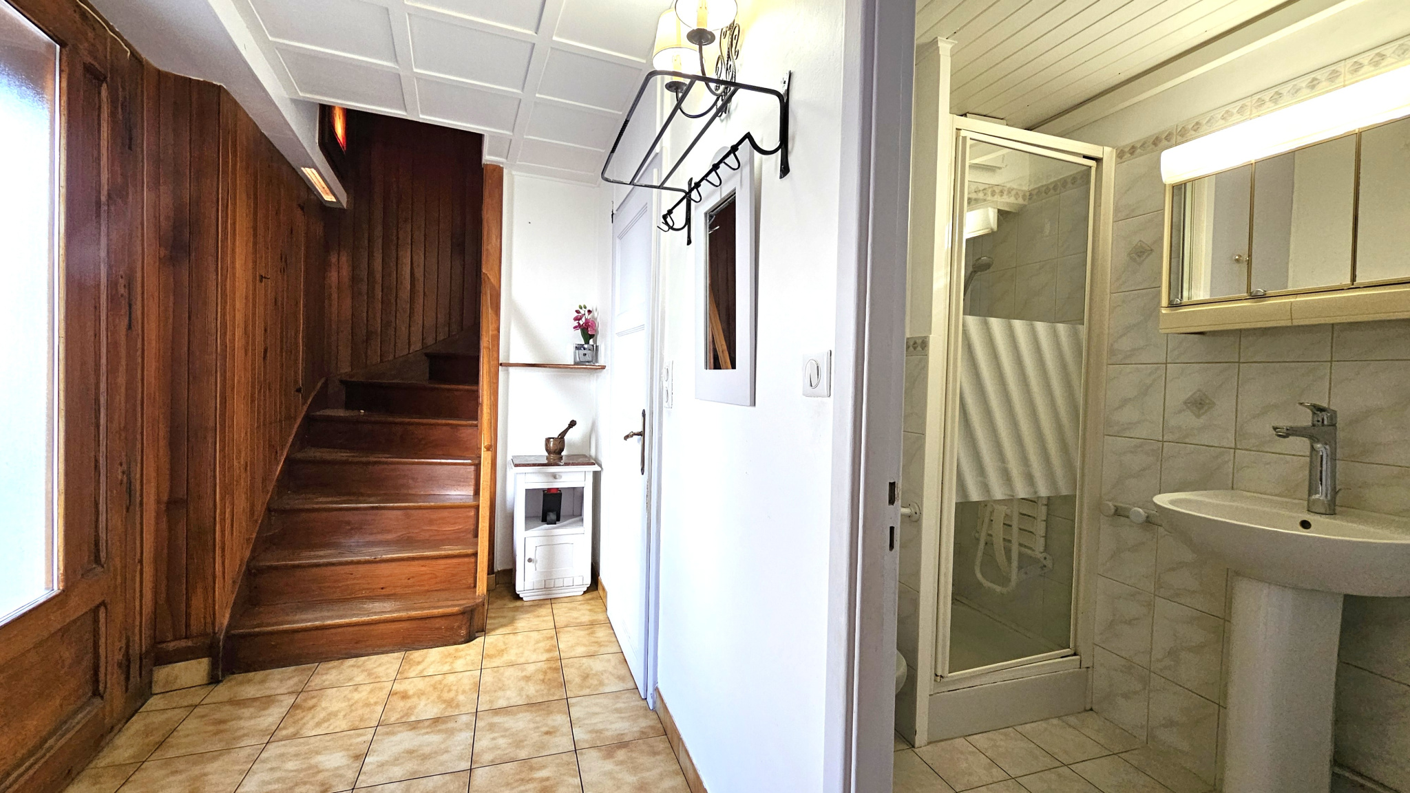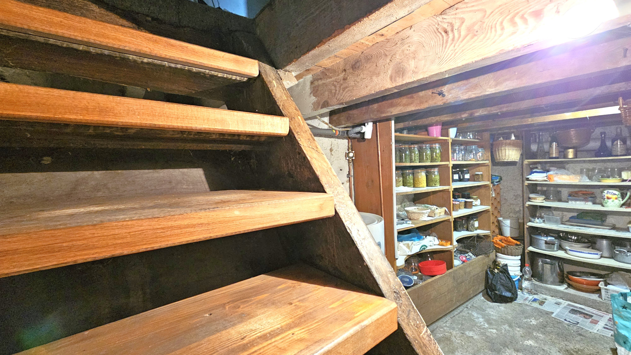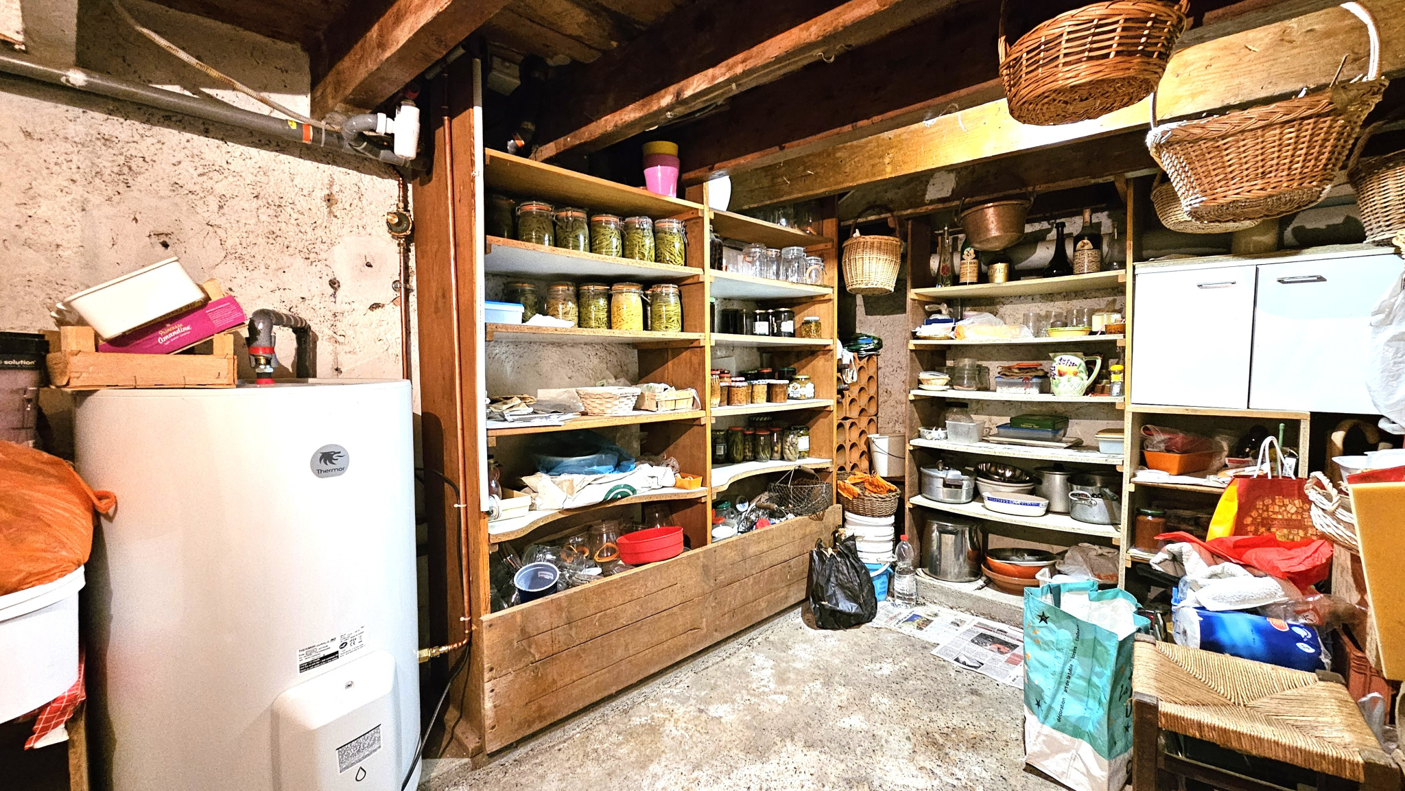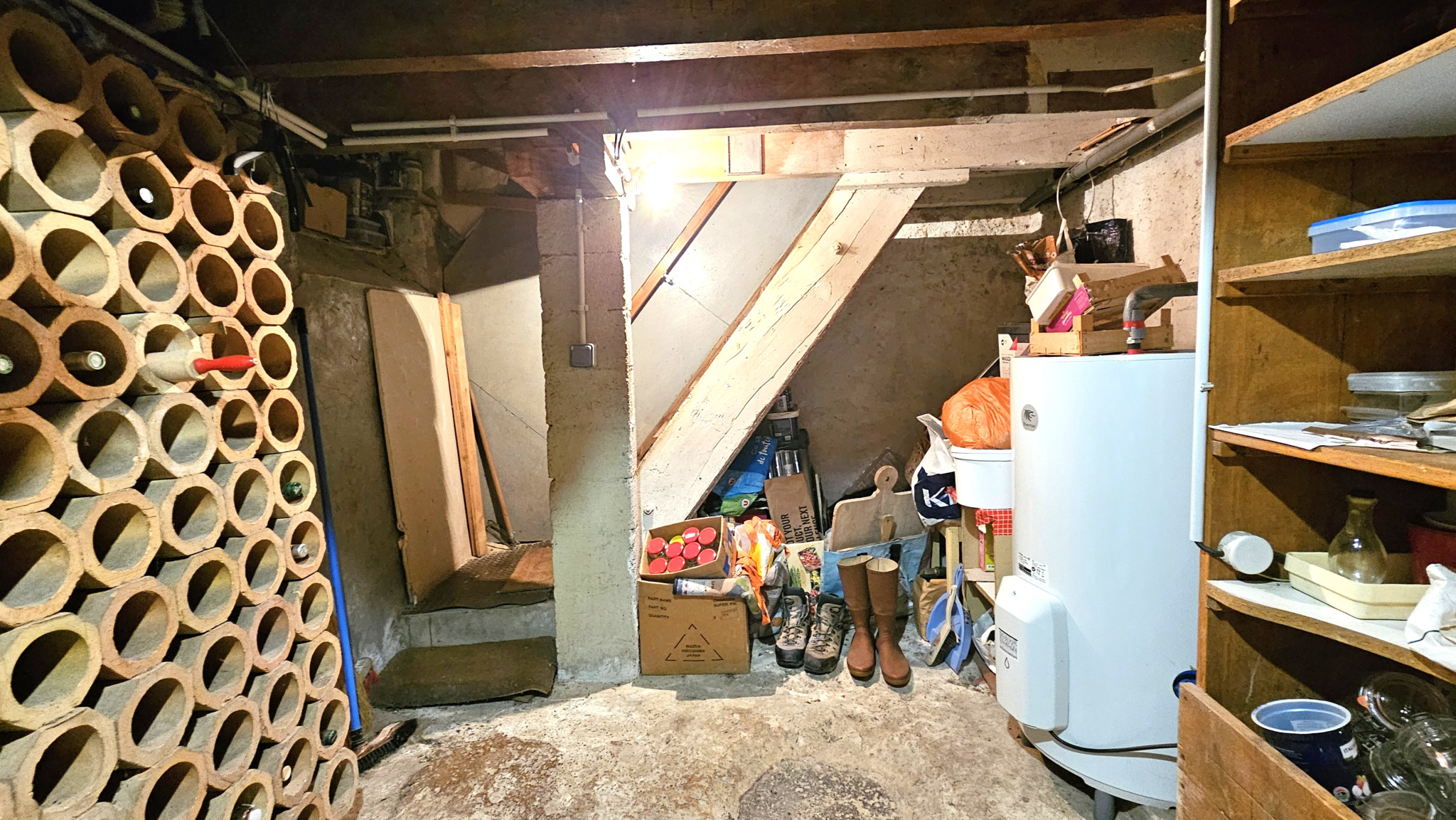 Au rez-de-chaussée, une entrée dessert une cuisine indépendante, une salle de bain avec WC, ainsi qu’un cellier / débarras offrant un accès direct à 11m2 de cave en sous-sol depuis l’intérieur de la maison.