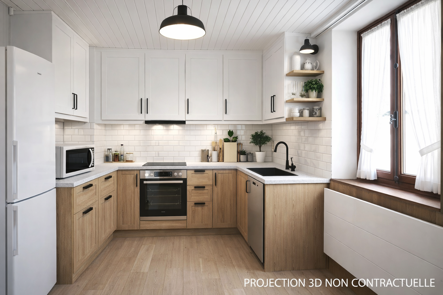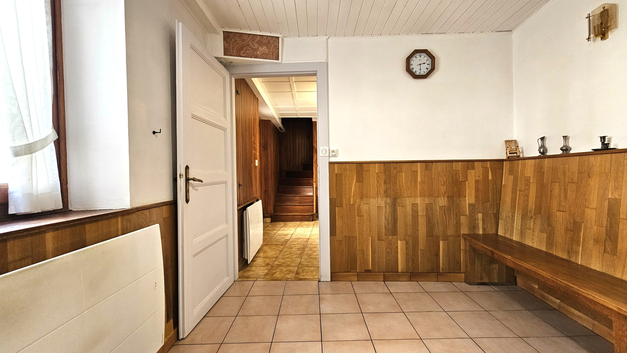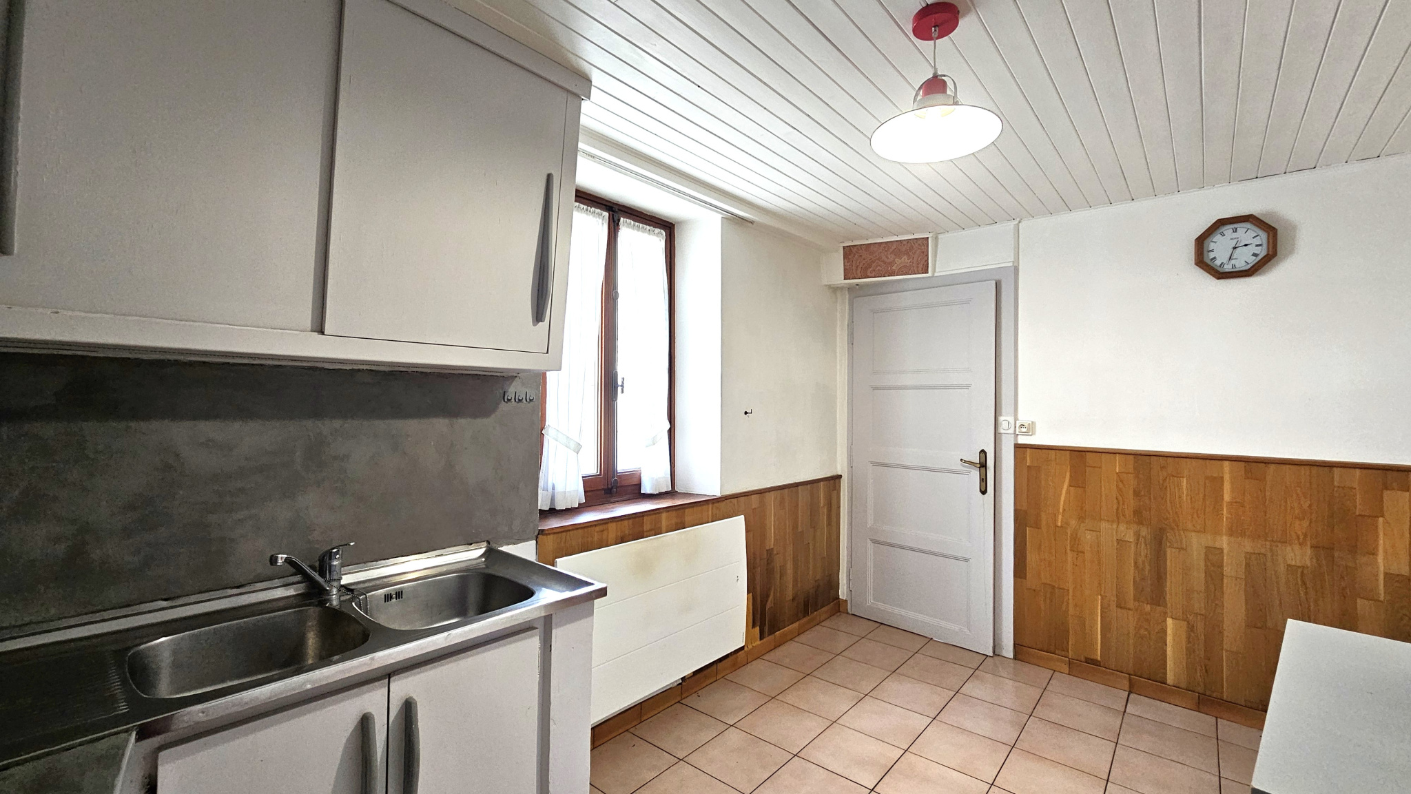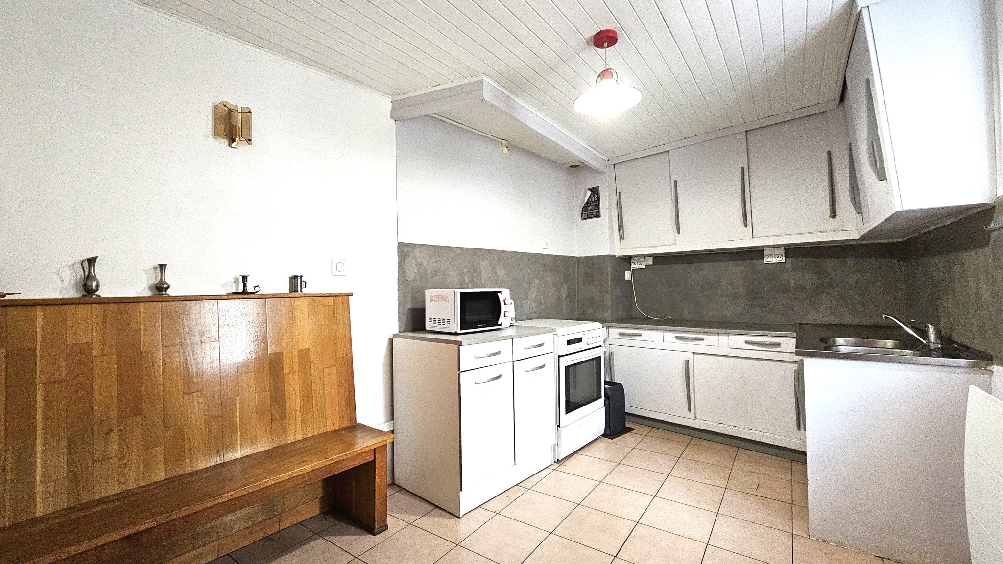 Au rez-de-chaussée, une entrée dessert une cuisine indépendante, une salle de bain avec WC, ainsi qu’un cellier / débarras offrant un accès direct à 11m2 de cave en sous-sol depuis l’intérieur de la maison.